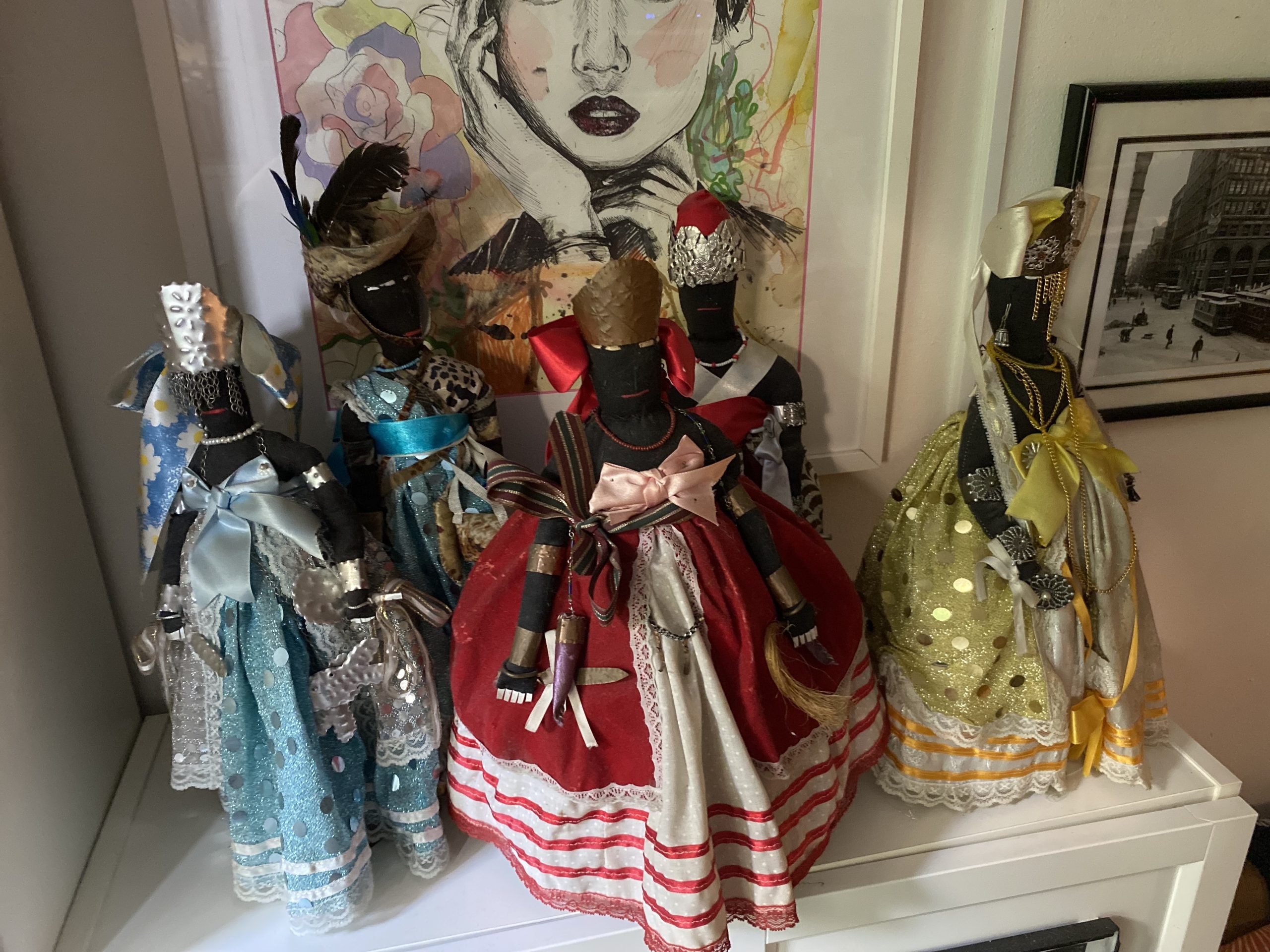 “My dolls dance in the house at night. They bring the Axé with me from Bahia. They protect us. They are beautiful and educational. They have been one of my most important references in the creation of orixa costumes for the stage, they are a point of reference for the vast orixa stories. The importance of cloth, dressing your gods in their finest cloths. I have been dancing and dialoguing with these dolls since 1987.” -Linda Yudin