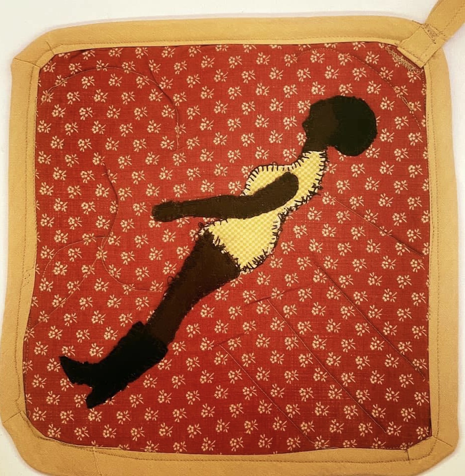 Pieza de tela acolchada con la aplicación de una mujer afroamericana con peinado afro y botas.